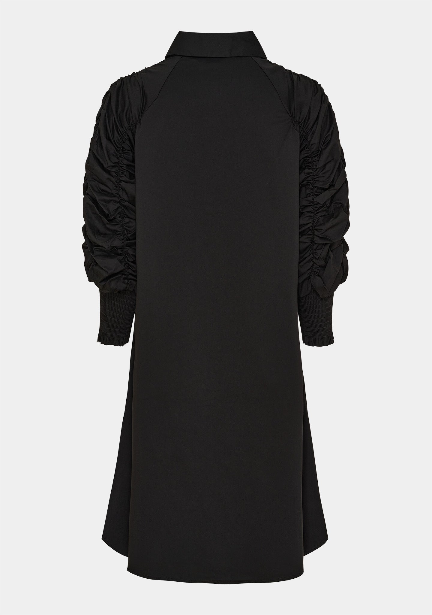 Denne skjortekjolen skiller seg ut med sine markante rynkedetaljer på ermene, som gir et eksklusivt og moderne uttrykk. Sigga Deco Dress kombinerer klassiske linjer med kreative detaljer, noe som gjør den ideell for både hverdagsbruk og spesielle anledninger.