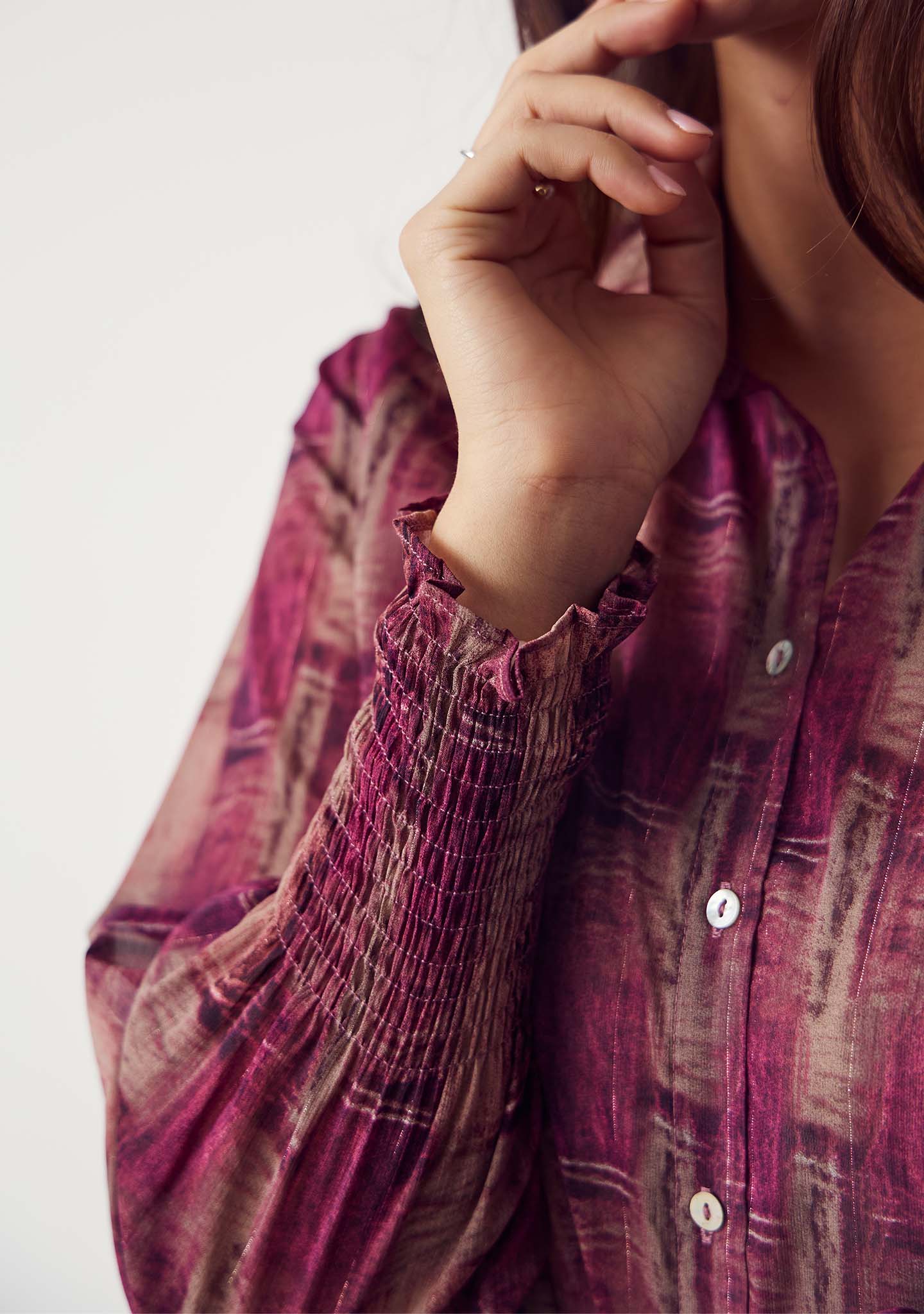 Vår elegante Vibse-skjorte er allsidig og kan styles på mange måter. Denne skjorten er gjennomsiktig i materialet og har en herlig løs og romslig passform. Den har en klassisk knappelukking med knapper hele veien ned og en spiss krage. Vibse-skjorten har et flatterende mønster og de fineste smock-detaljer ved ermeåpningen, som bidrar til å skape et feminint utseende. Den kan med fordel styles med et par bukser eller en stilig skjørt. Og gjerne et par klassiske loafers for en fullendt elegant look.