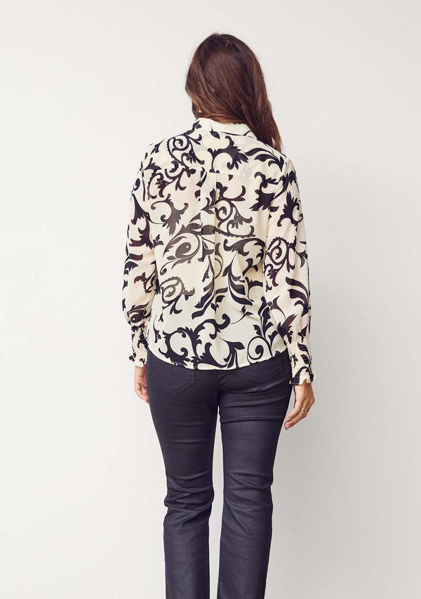 Vår elegante Vibse-skjorte er allsidig og kan styles på mange måter. Denne skjorten er gjennomsiktig i materialet og har en herlig løs og romslig passform. Den har en klassisk knappelukking med knapper hele veien ned og en spiss krage. Vibse-skjorten har et flatterende mønster og de fineste smock-detaljer ved ermeåpningen, som bidrar til å skape et feminint utseende. Den kan med fordel styles med et par bukser eller en stilig skjørt. Og gjerne et par klassiske loafers for en fullendt elegant look.