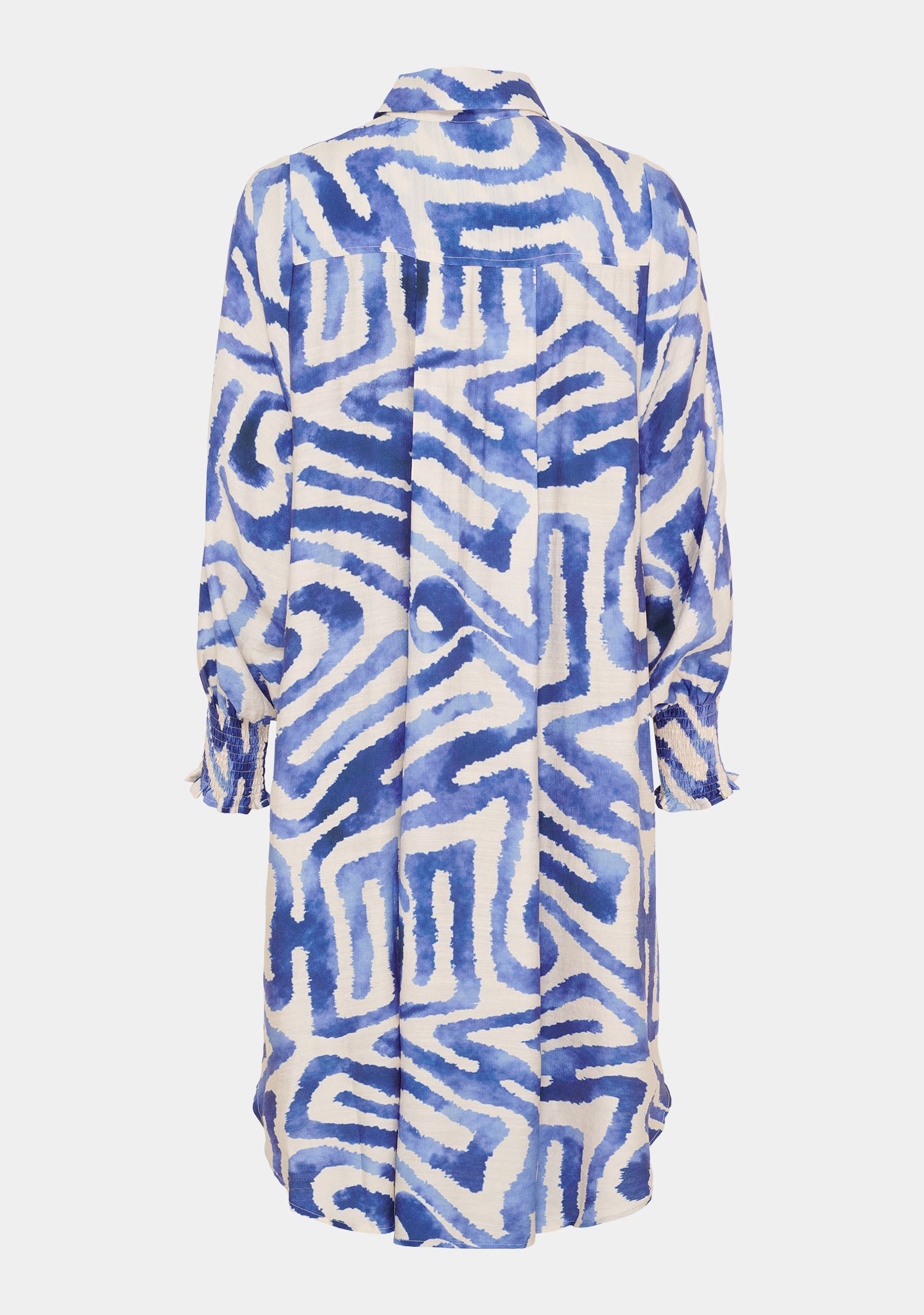 Ane Printed Dress er en stilig kjole med et moderne trykk og et avslappet uttrykk. Den har en klassisk skjortekrage og knappelukking, som gir kjolen et enkelt og tidløst utseende. Ermene er lange og avsluttet med rynket kant, som gir en behagelig passform og et feminint preg. Den buede kanten legger til et lett fall, som støtter kjolens avslappede passform. Laget av en myk viskoseblanding med polyamid, som føles behagelig mot huden og faller vakkert.