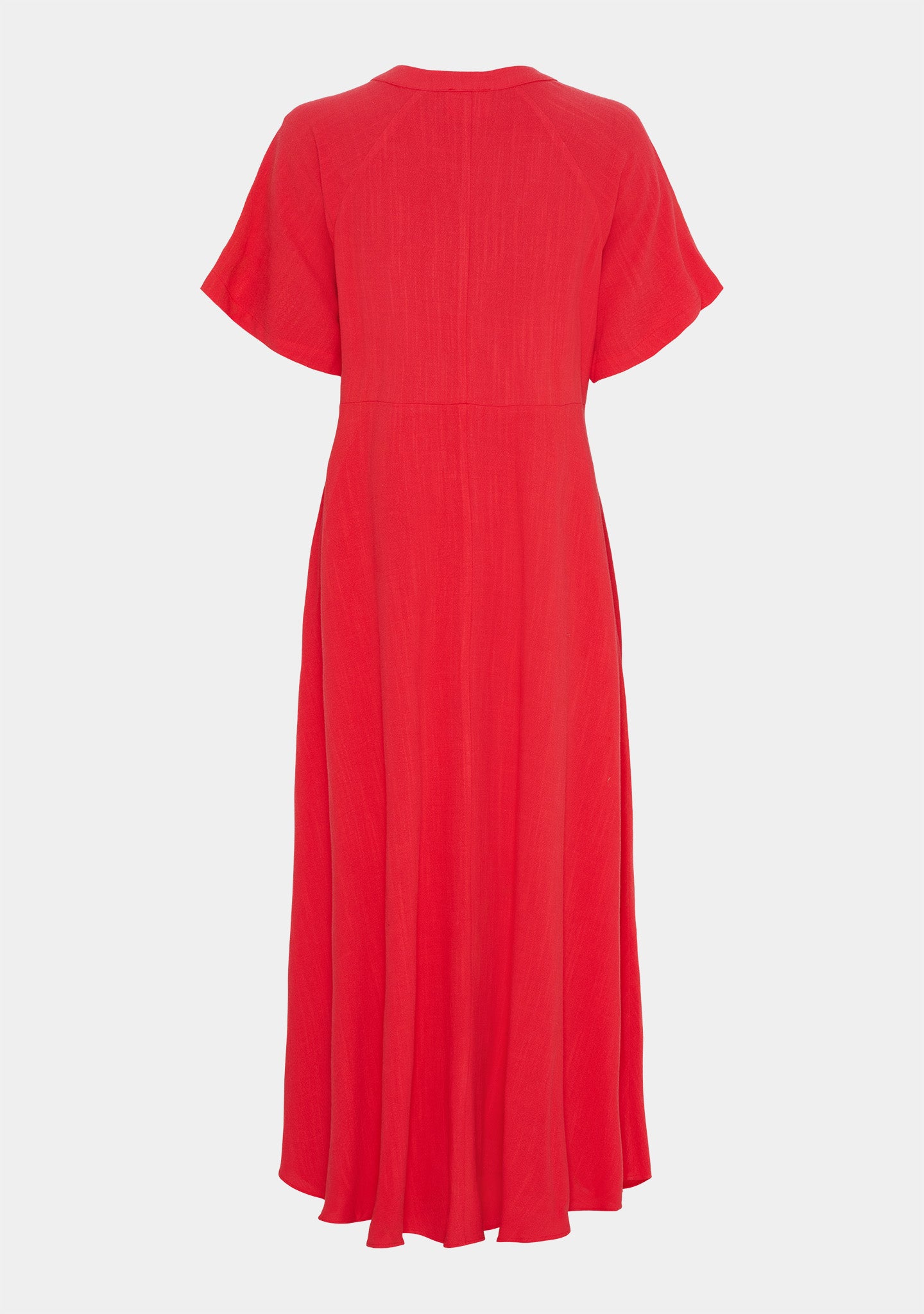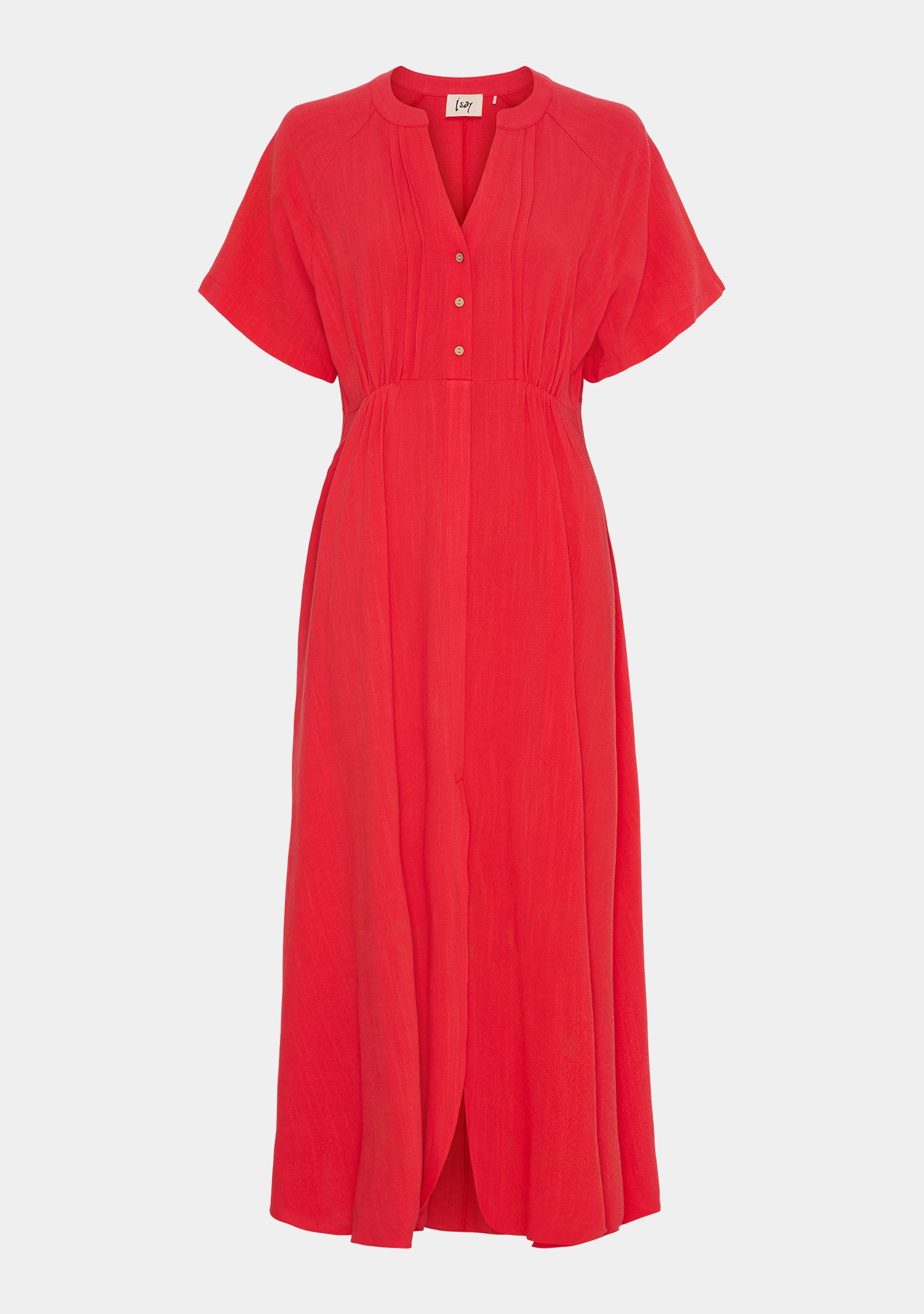 Den definerte midjen med lett drapering gir form uten å være stram, og de små knappene foran tilfører en fin detalj. De korte, løse ermene holder stilen avslappet, mens splitten foran gir litt ekstra luft.