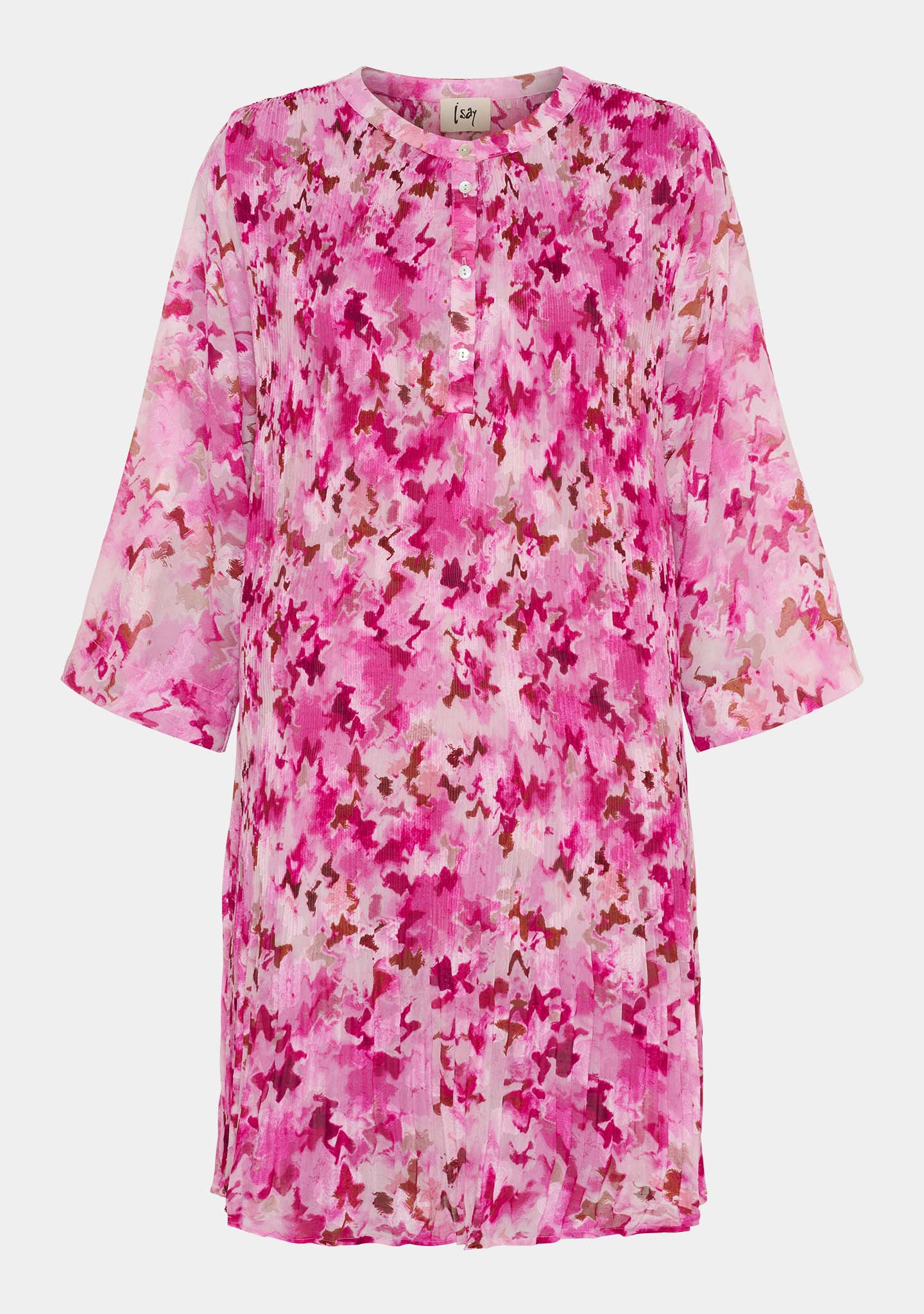Pleated dress with stunning details, guaranteed to enhance your wardrobe. The dress is loose-fitting in a light fabric, which is slightly transparent. The fabric and beautiful print combo create a lovely feminine balance. It features buttons at the neck, which can be undone to create a V-neck. The sleeves are 3/4-length and wide for an ultra-cool and trendy look. Perfect with bare legs or over a pair of pants.