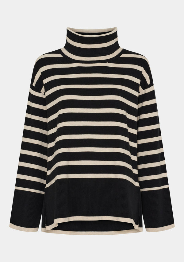 Frigga Rullekragegenser er den perfekte kombinasjonen av klassisk strikk og moderne komfort. Det tidløse stripede designet gir et elegant og allsidig utseende, mens den myke bomullsblandingen sikrer en behagelig følelse hele dagen. Den lett oversized passformen skaper et avslappet utseende med et eksklusivt preg.