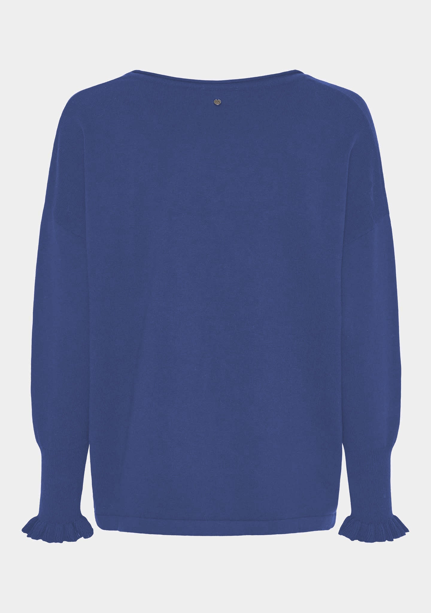 Frigga Smock Pullover er en myk og komfortabel strikkegenser som kombinerer avslappet komfort med feminine detaljer. Den enkle V-halsen har en fint strikket kant som gir et elegant utseende. Strikken har lange ermer med smock-mansjetter og små rysjer, noe som skaper et romantisk og lett uttrykk. Laget av en bomullsblanding med en liten mengde elastan, gir strikken behagelig stretch og sikrer god bevegelighet.