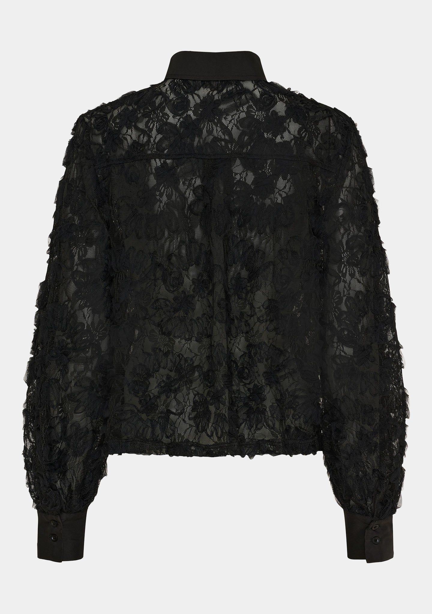 Kikki Shirt er en feminin skjorte med et unikt uttrykk. Den gjennomsiktige blondeeffekten gir en lett og luftig følelse, mens den klassiske skjortekragen og den skjulte knappelukkingen gjør designet tidløst og allsidig.