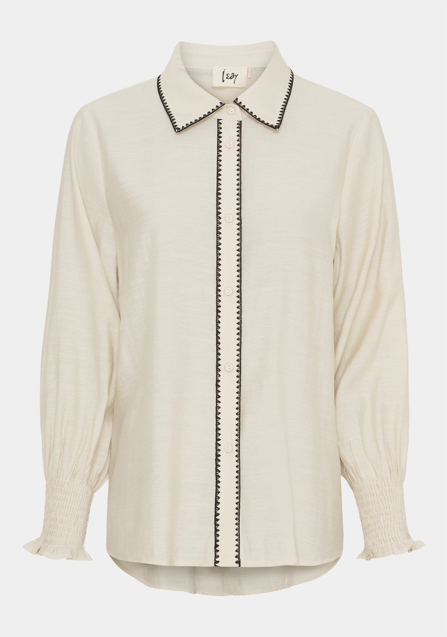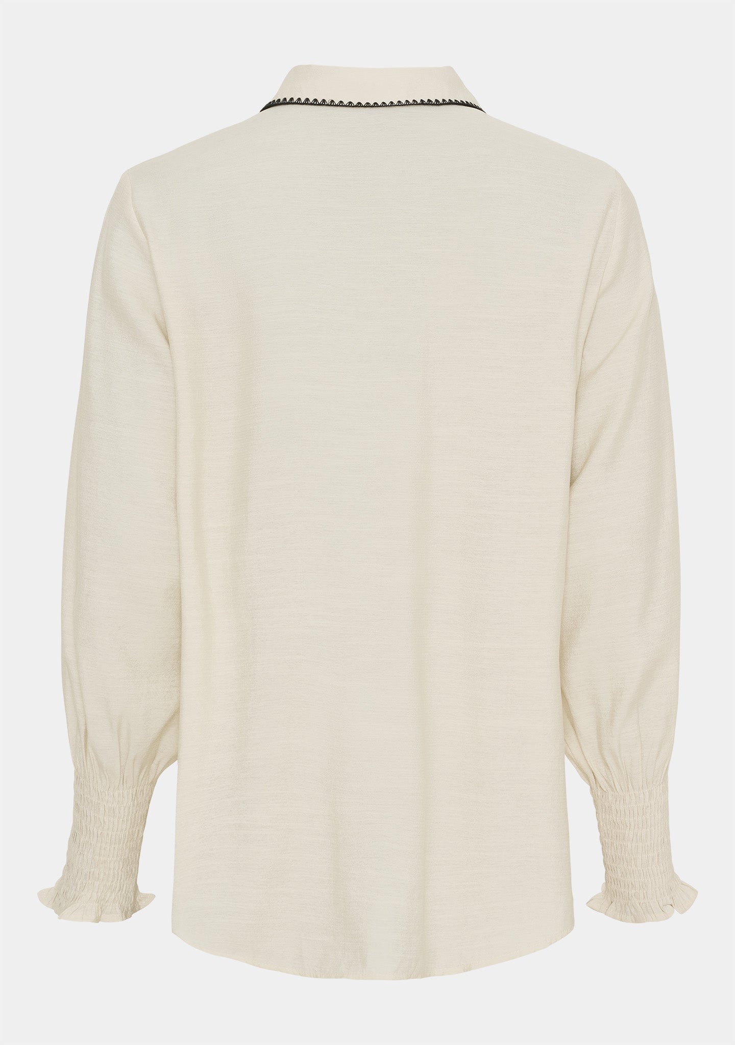 Lara Shirt er en stilig skjorte med et feminint preg. Den avslappede passformen gjør den behagelig å ha på, mens de fine detaljene som skjortekragen og knappene gir den et klassisk utseende. Langs kragen og knappestolpen finner du en elegant kontrastkant som gir skjorten et unikt preg. De lange ermene er avsluttet med smock og en lett rysjekant, som understreker det feminine designet.