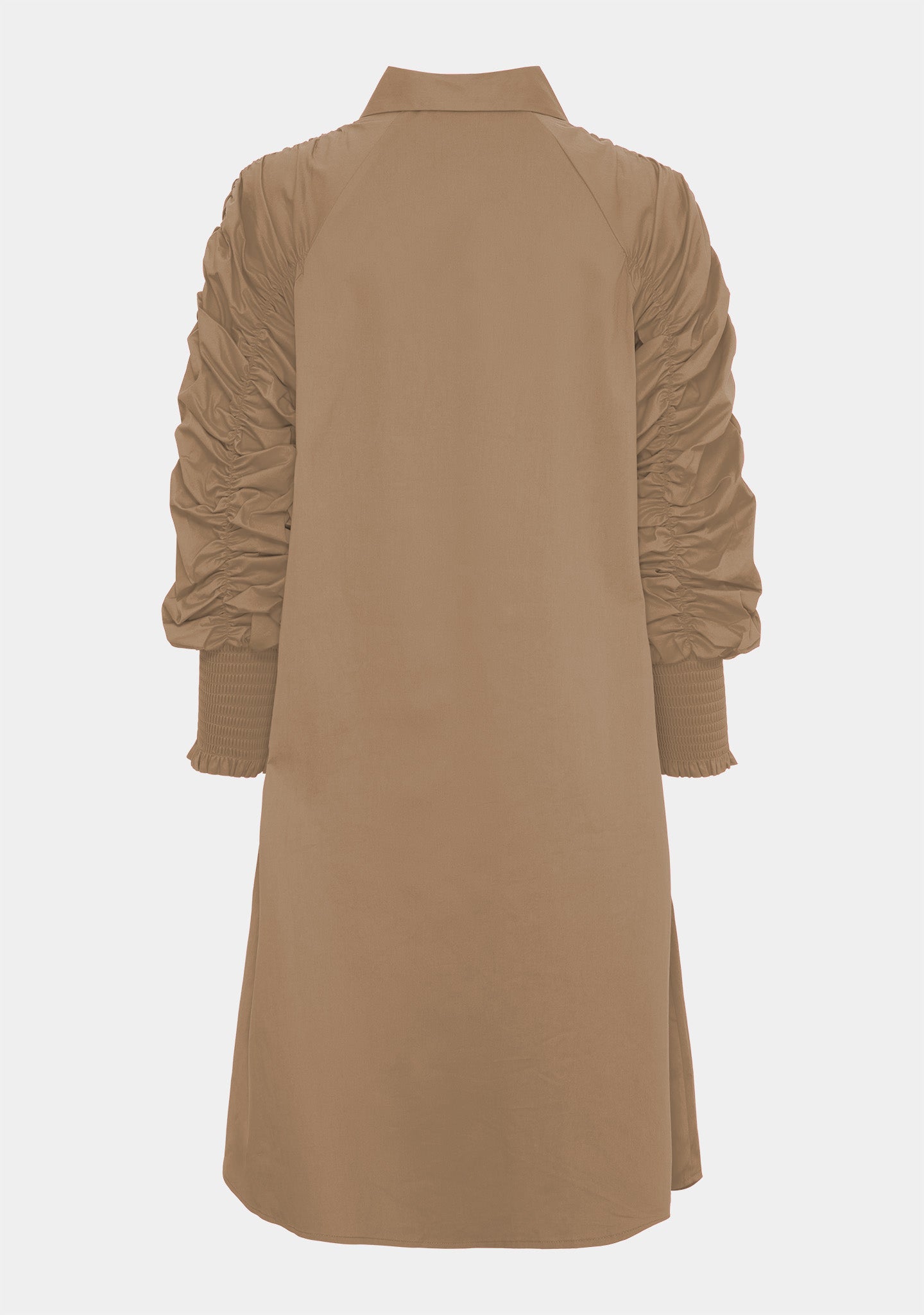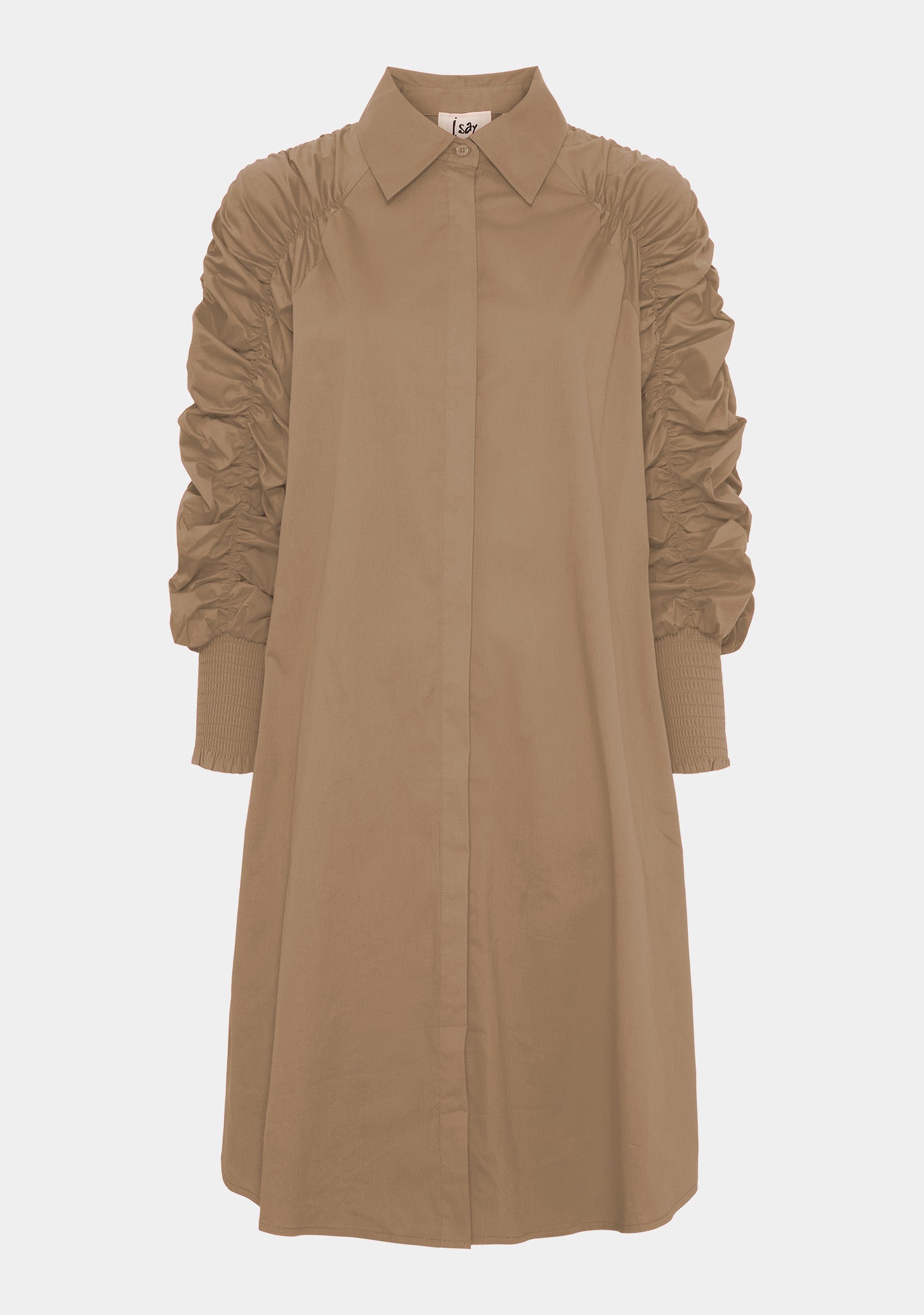 Denne skjortekjolen skiller seg ut med sine markante rynkedetaljer på ermene, som gir et eksklusivt og moderne uttrykk. Sigga Deco Dress kombinerer klassiske linjer med kreative detaljer, noe som gjør den ideell for både hverdagsbruk og spesielle anledninger.