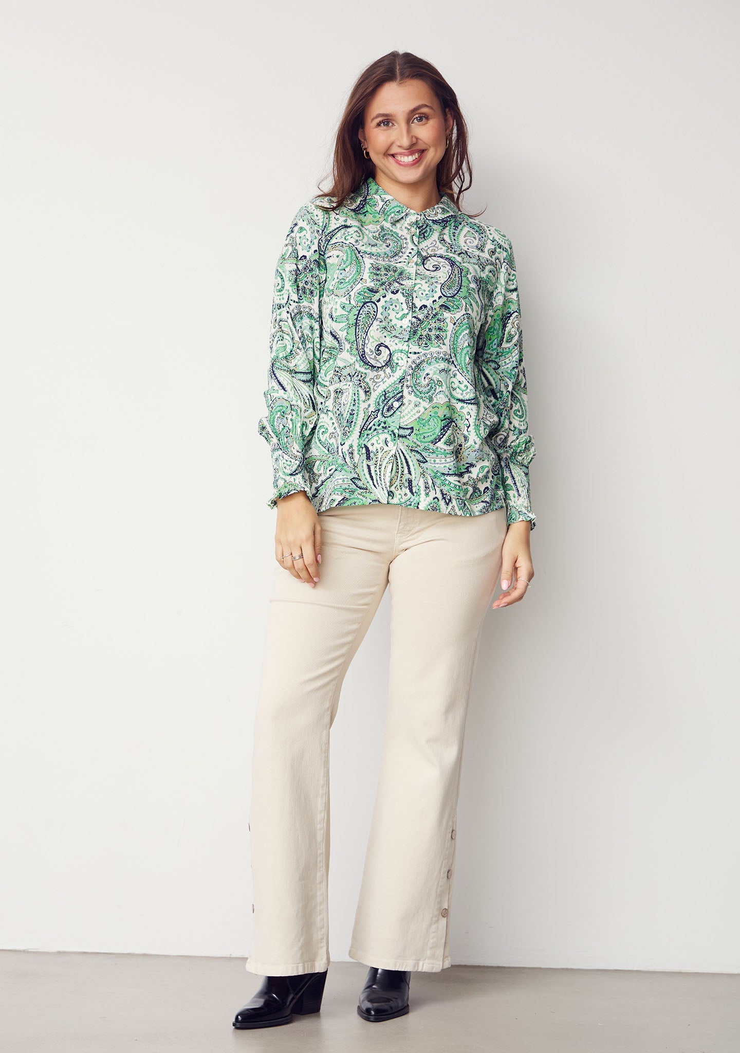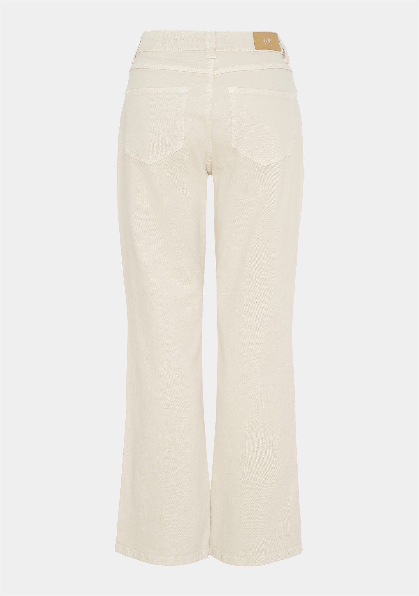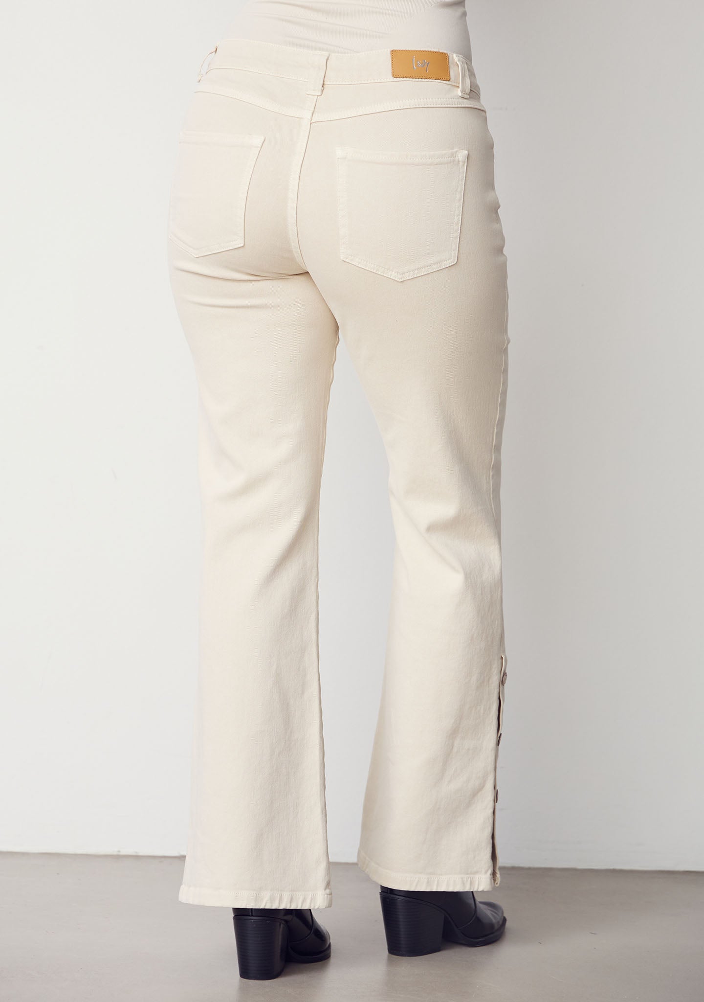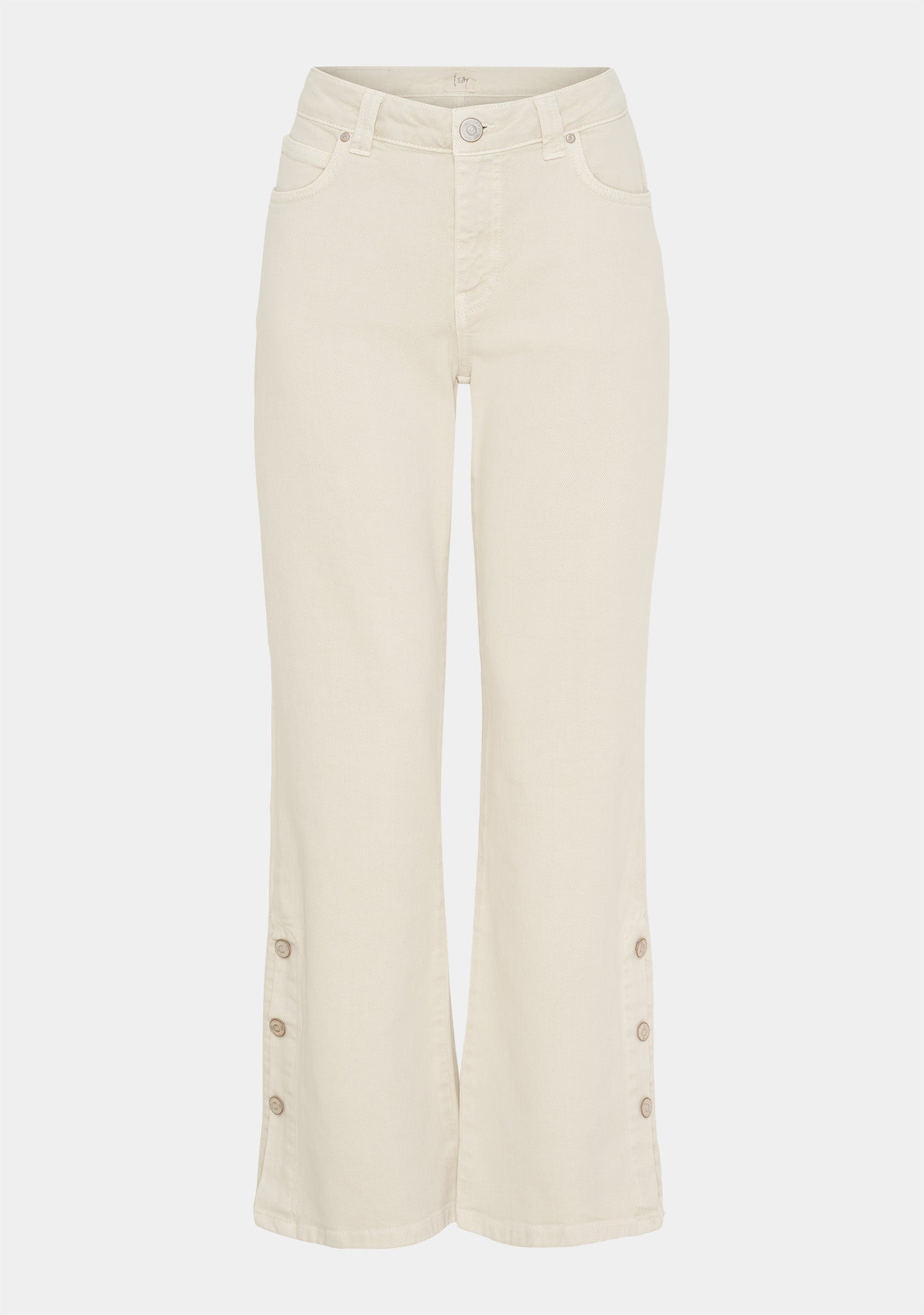 Como Twill Button Pant kombinerer klassiske denimdetaljer med en feminin vri. Den flatterende flare passformen sitter tett rundt hofter og lår og får ekstra vidde fra kneet ned. Dekorative knapper ved anklene legger til et elegant og unikt preg. Buksen er laget av en myk bomullsblanding med stretch, som sikrer høy komfort og god bevegelsesfrihet hele dagen. Fast linning med beltestropper, klassisk 5-lommers design og glidelåslukking med knapp fullfører looken.
