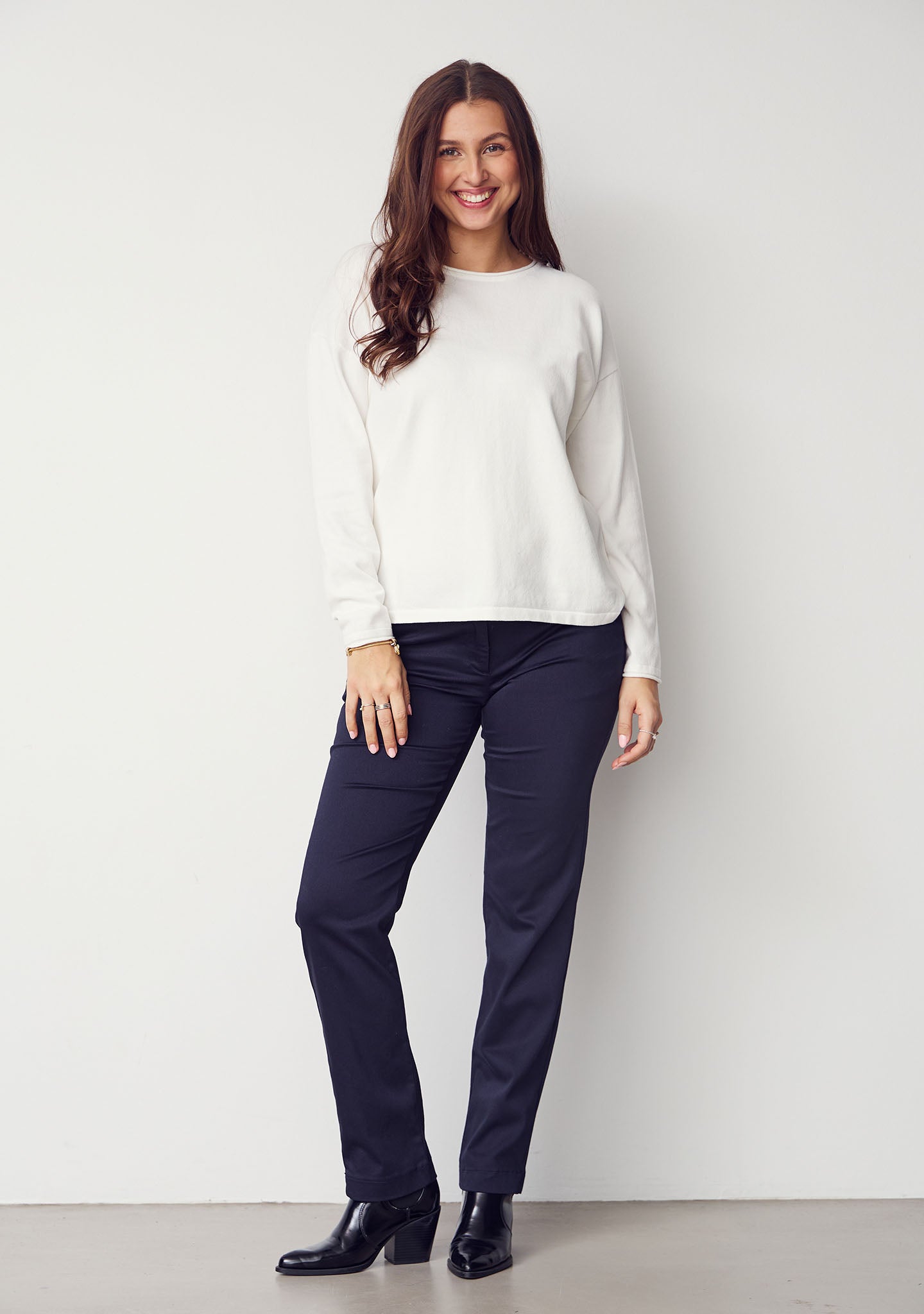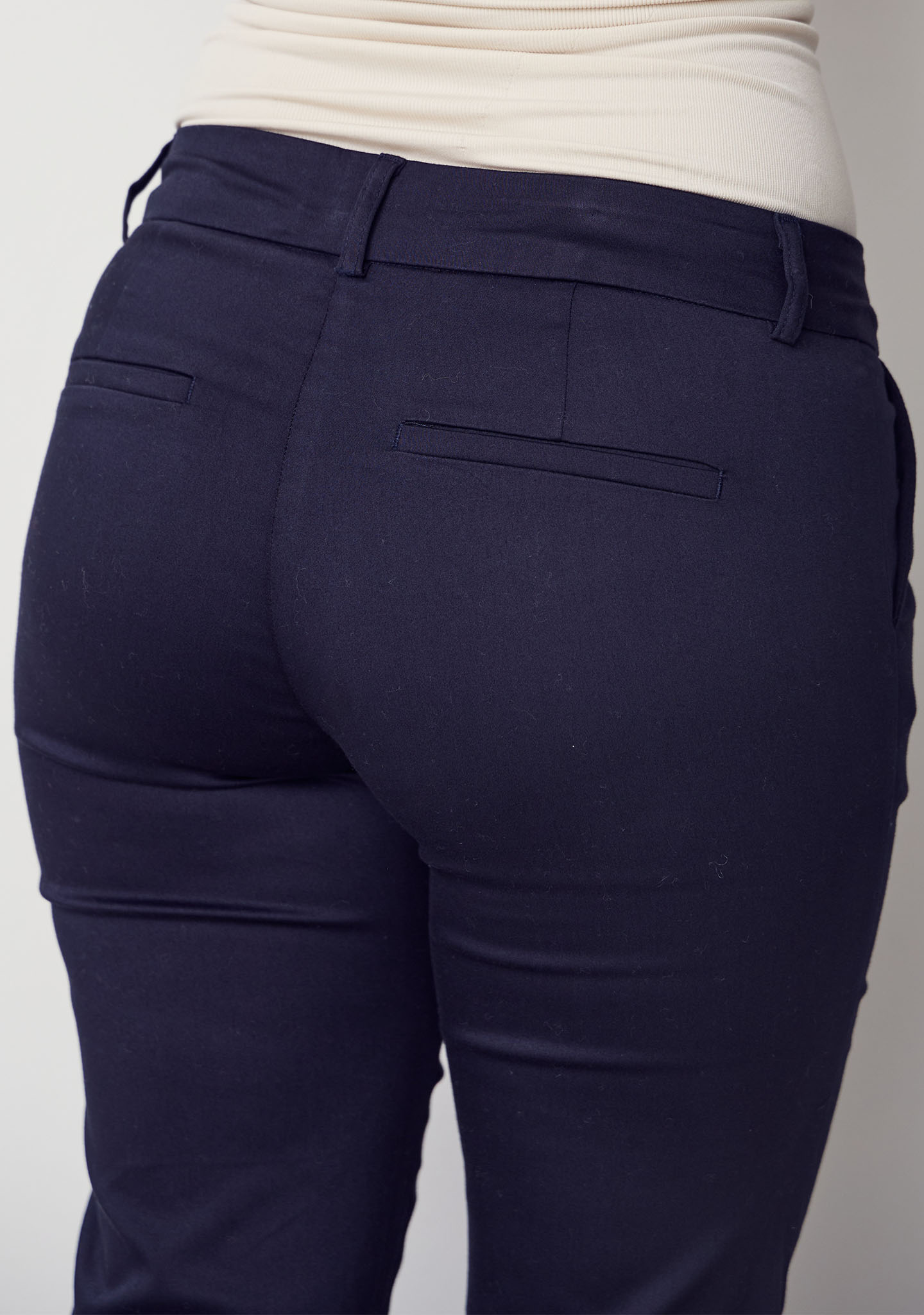 Her er våre klassiske bukser, Isay Classic Pant. De har en mediumhøy midje og en tidløs passform som sitter tett rundt hoftene, er litt løsere ved benene og smalner av mot ankelen. Isay Classic Pant har en elegant og klassisk design og er komfortable å ha på hele dagen. De er hovedsakelig laget av bomull, polyester og elastan, noe som gir deg utmerket bevegelsesfrihet og sikrer at de sitter godt på kroppen. Buksene har en fast linning som lukkes med to knapper, beltehemper, lommer og kommer i full lengde.