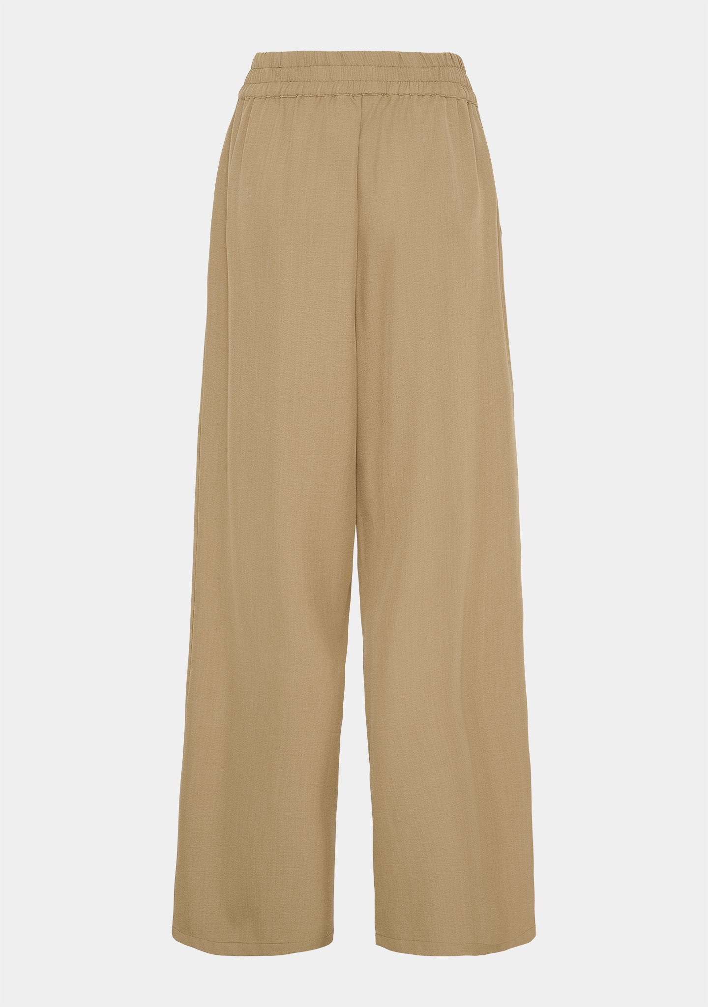 Liona Pant er et par elegante bukser med avslappet passform og mye komfort. De har en flatterende høy midje med fast frontlukking og elastikk bak, som sikrer både et pent utseende og en behagelig passform. Buksene har vide ben som faller vakkert og skaper en tidløs silhuett. Laget av en lett og elastisk polyesterblanding med elastan, som gir både bevegelsesfrihet og et stabilt uttrykk.