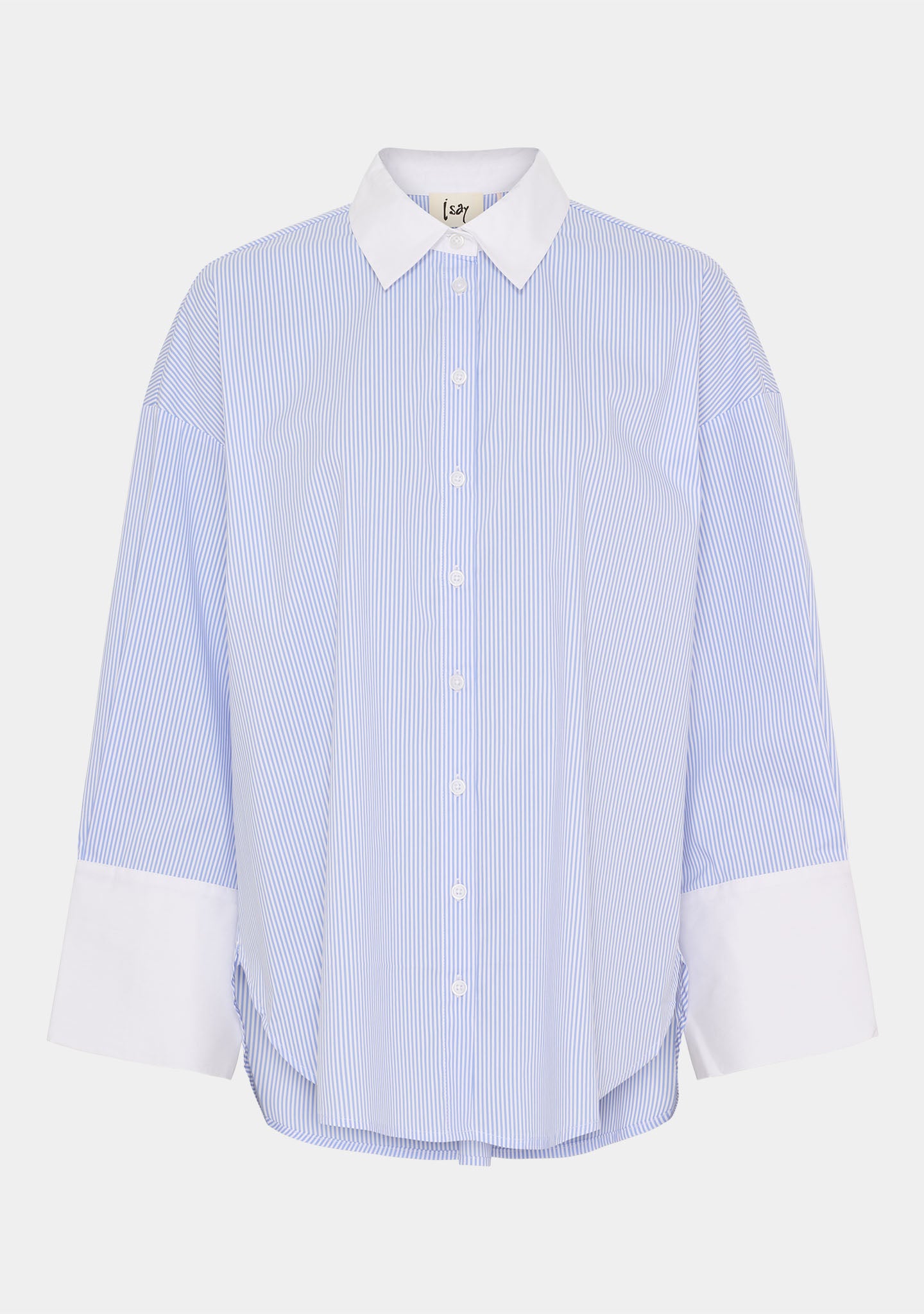 Sigga Contrast Shirt er en stilig skjorte med et moderne preg. Den har en løs og oversized passform, som gir et avslappet og kult utseende. Klassiske detaljer som skjortekrage og gjennomgående knappestolpe får nytt liv med kontrastmansjetter og krage som gir skjorten et grafisk og sofistikert uttrykk. De brede mansjettene med knapper understreker det elegante designet, mens den buede kanten skaper en avslappet silhuett. Laget av en bomullsblanding med stretch, som gjør skjorten behagelig å ha på seg og gir god bevegelighet.