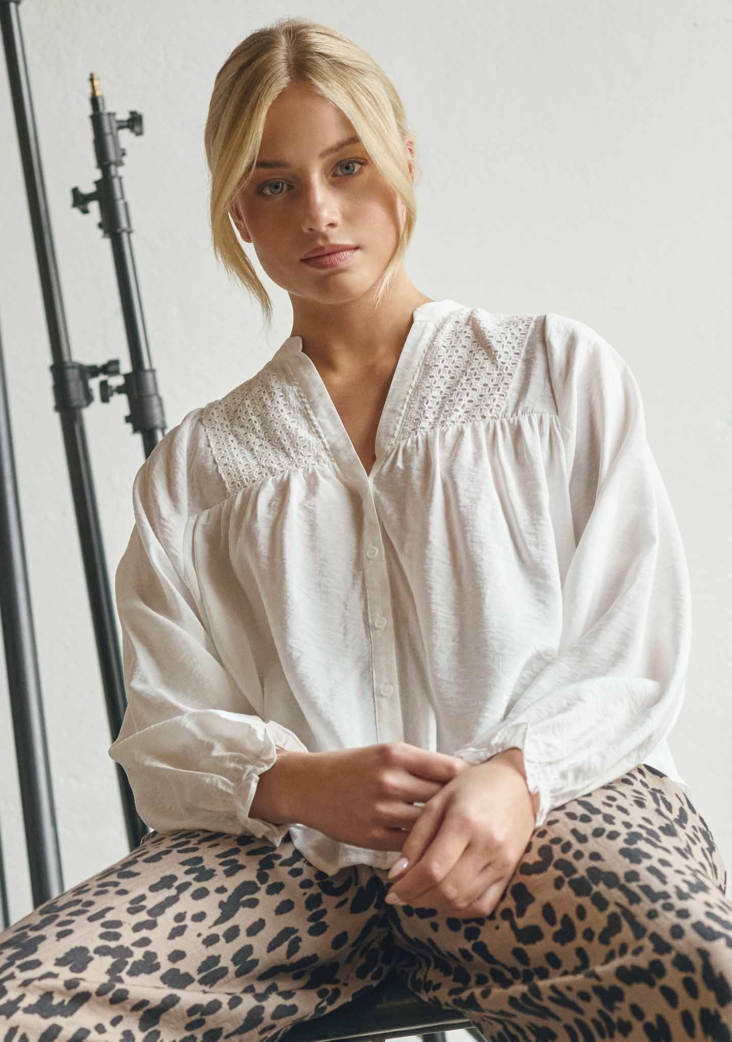 Mist Skjorte er en lett og feminin skjorte med fine detaljer som legger til litt ekstra uten å dominere. De broderte panelene foran skaper struktur og lek, mens den myke kvaliteten får den til å falle naturlig og bevege seg lett rundt kroppen.
