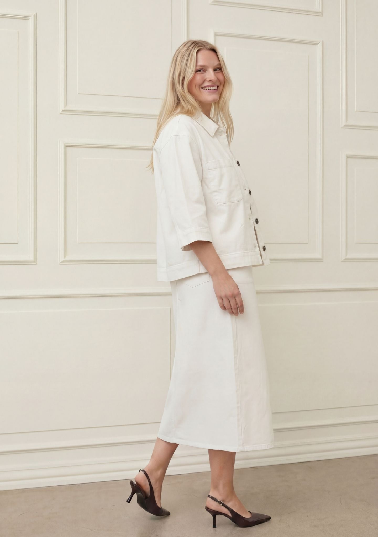 Den korte lengden gir en fin balanse i silhuetten og fungerer spesielt godt over kjoler og med høyt livede bukser. De 3/4-lange ermene gir et lett og avslappet utseende, noe som gjør jakken ideell som både et overgangsplagg og en lett sommerjakke.