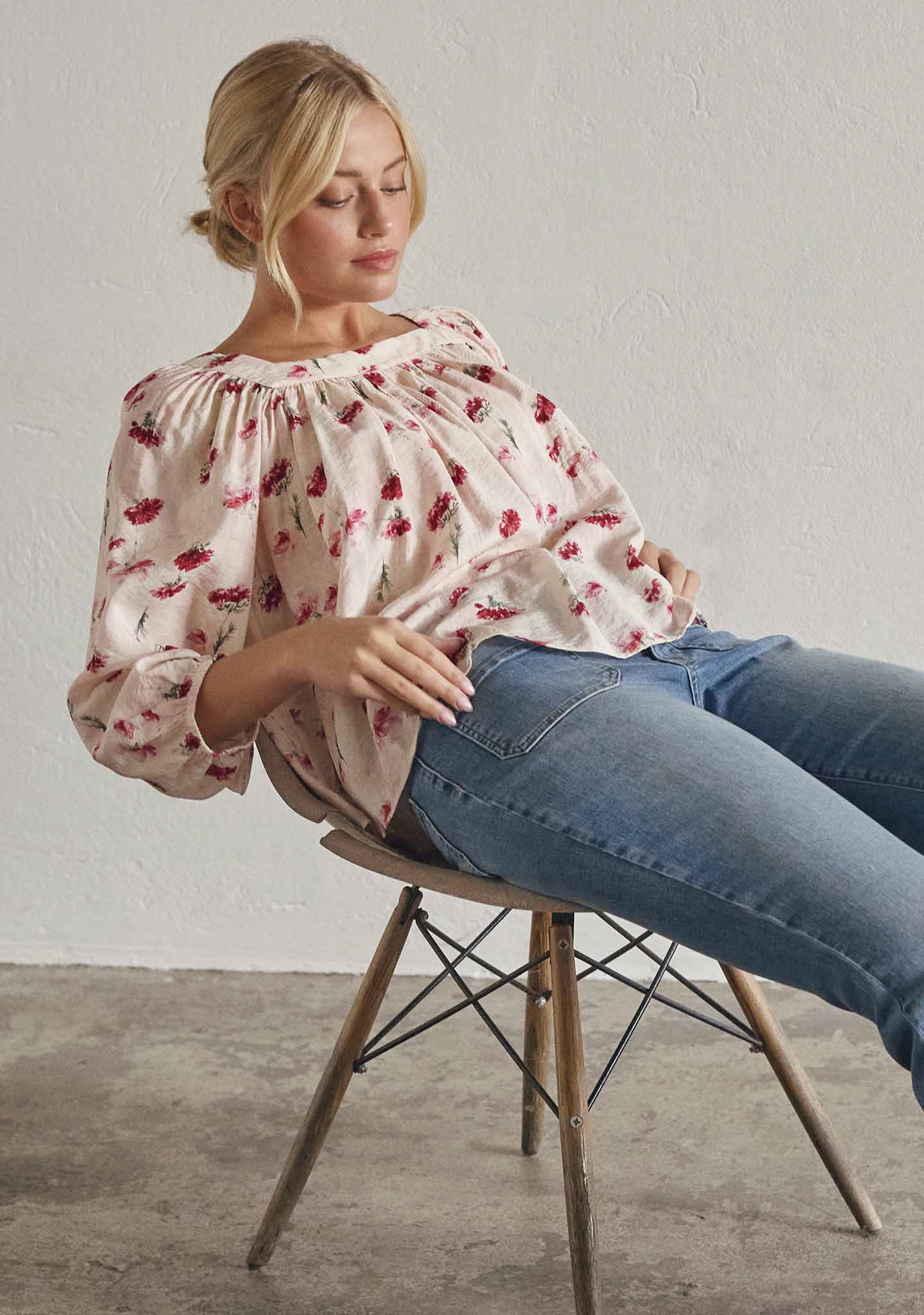 Manny Blouse er en lett og feminin bluse med et mykt fall og et romantisk blomstertrykk. Den brede utringningen gir et åpent og flatterende utseende, mens rynkene over brystet og ryggen skaper bevegelse og volum.